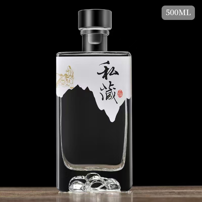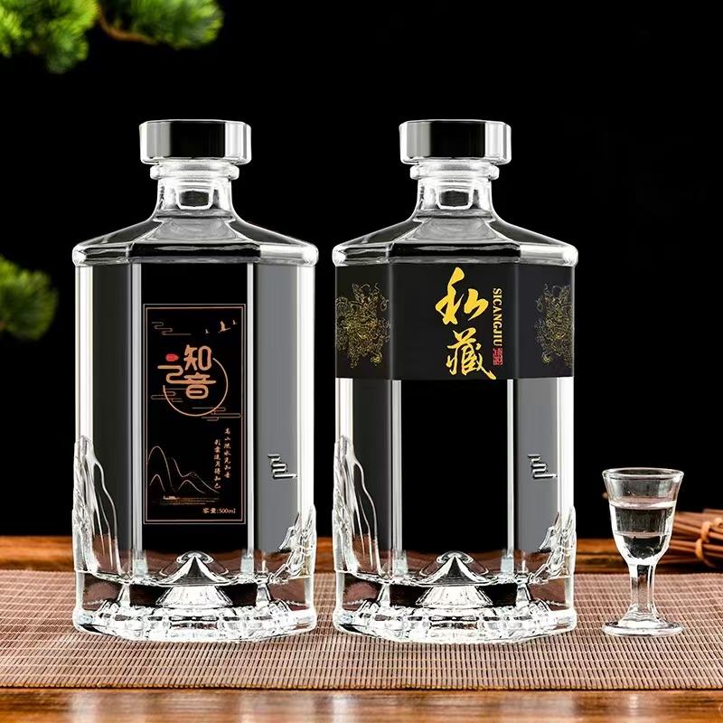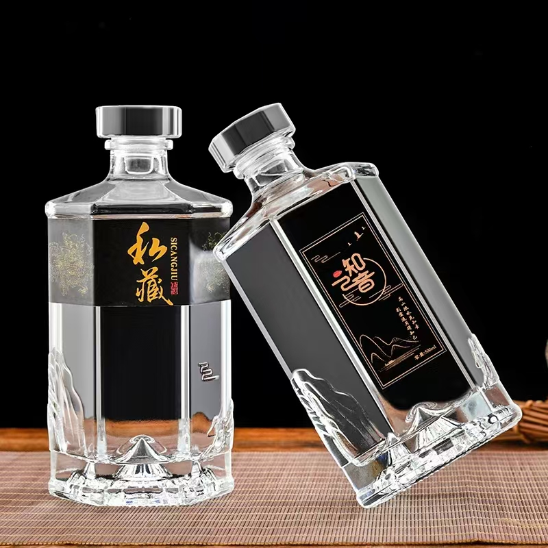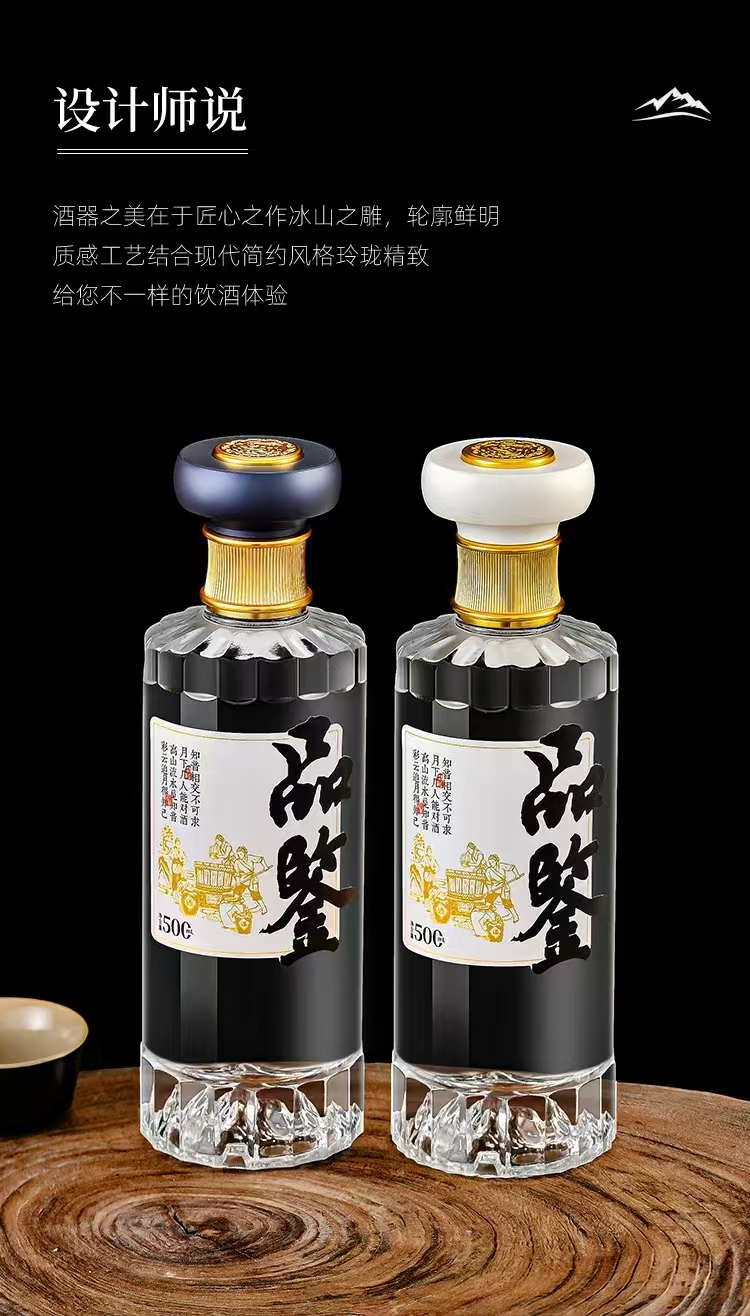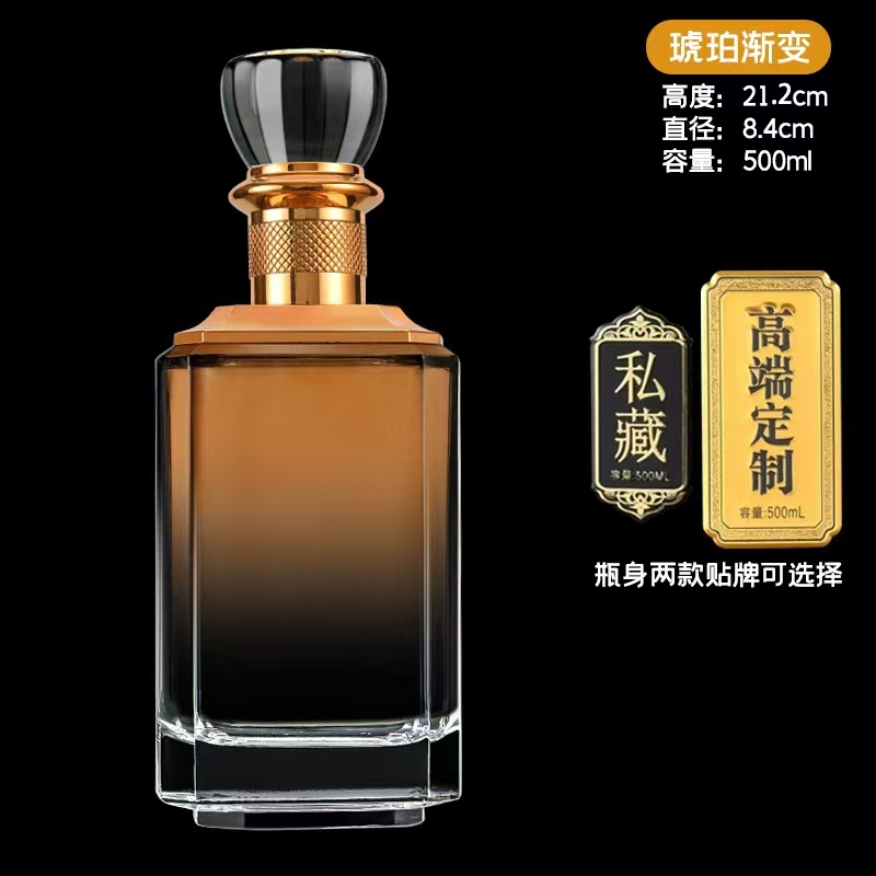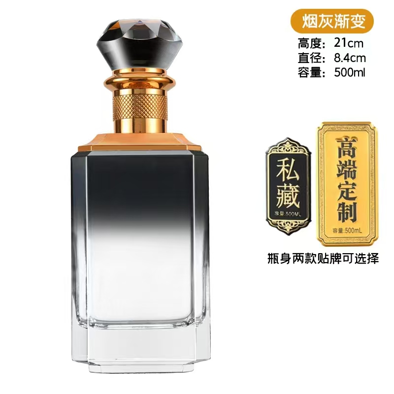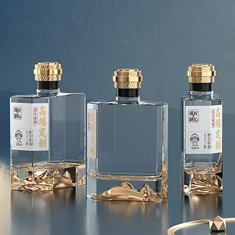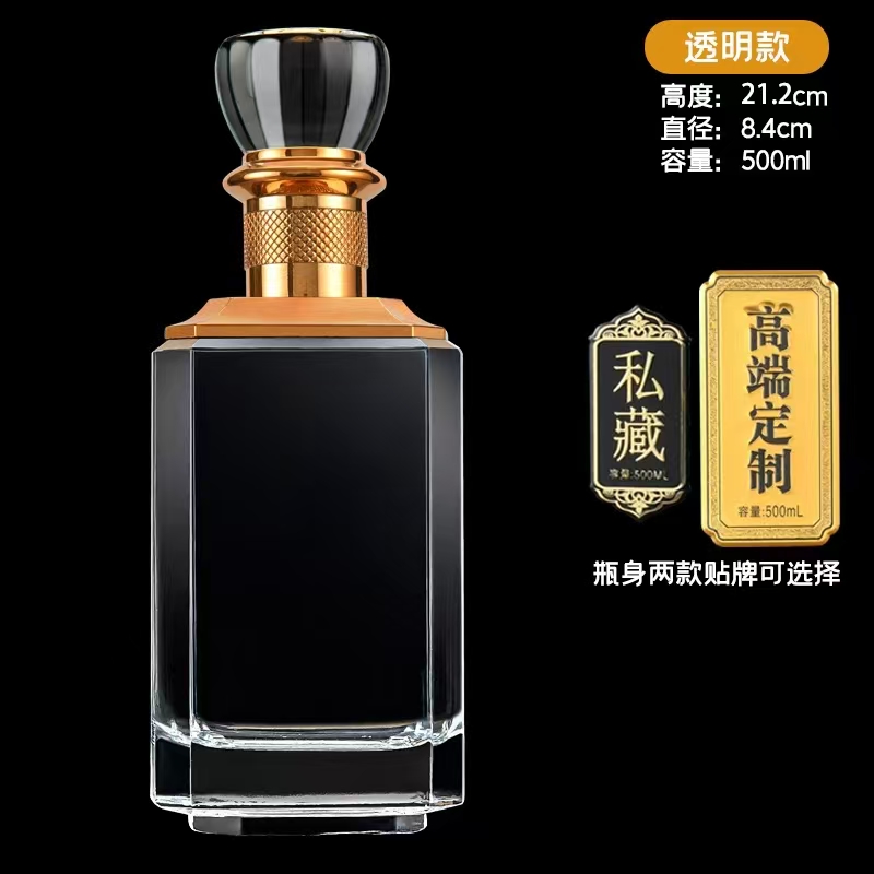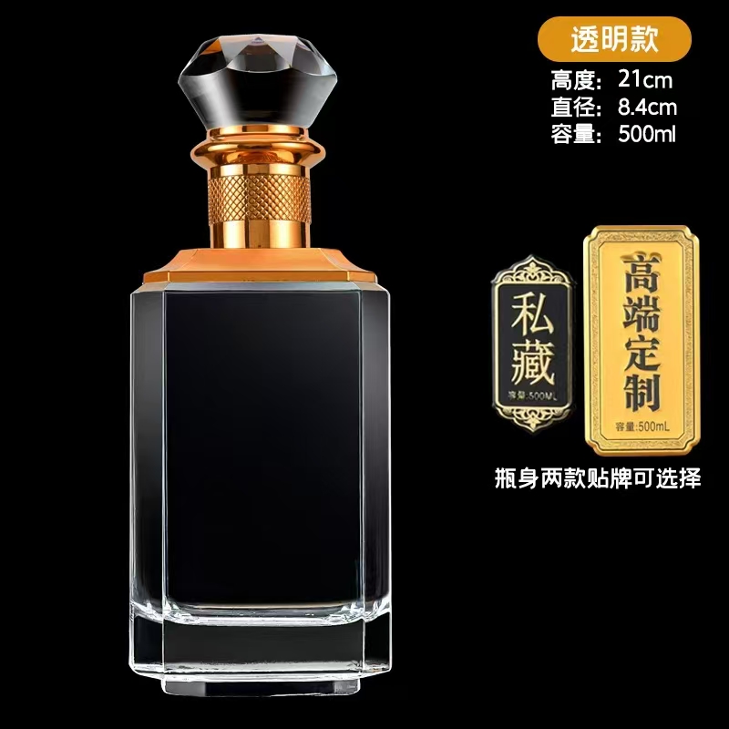 晶白酒瓶采用高透明度水晶玻璃材质,质地坚硬、折射率高,呈现出晶莹剔透的视觉效果。其原料中二氧化硅含量高,经1600℃高温熔炼成型,具备优良的密封性与避光性,能有效保护酒体,提升陈藏价值。瓶身设计典雅,常用于中高端白酒包装,兼具实用与收藏价值。
